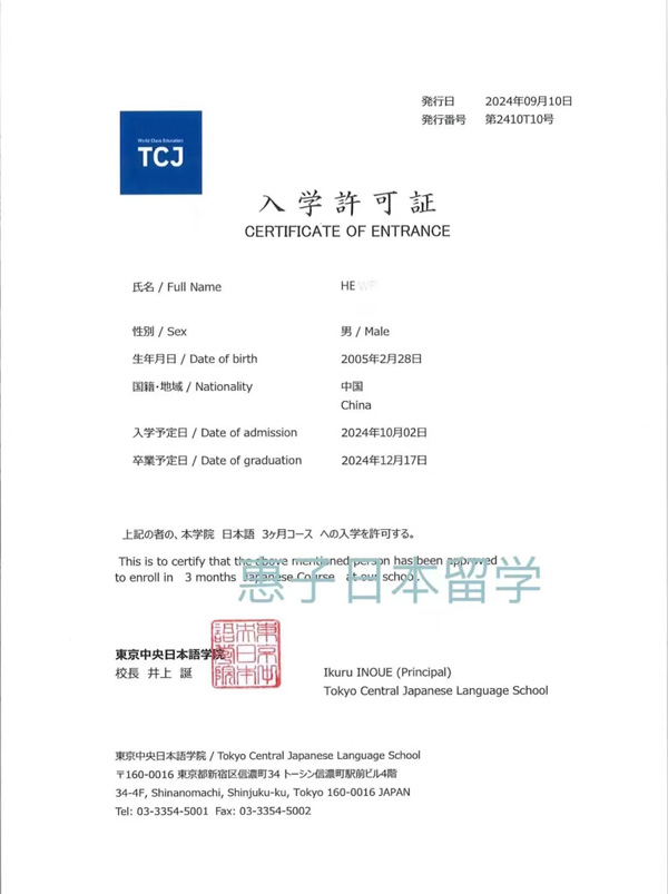 祝惠子日语社学员2024年10月入学日本东京JCL