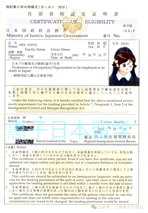 恭喜惠子日语社学员顺利拿到日本东京霞山会东亚学院的在留资格证明书