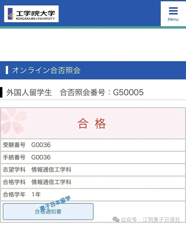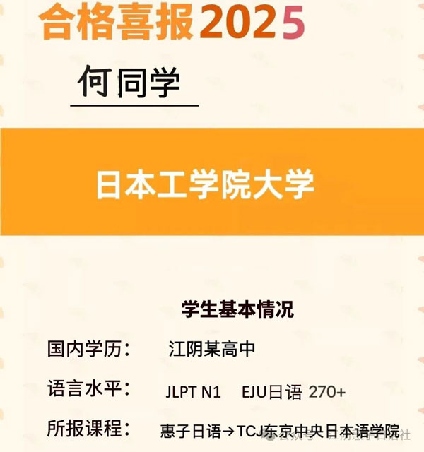 祝贺惠子日语社学员考取日本工学院大学